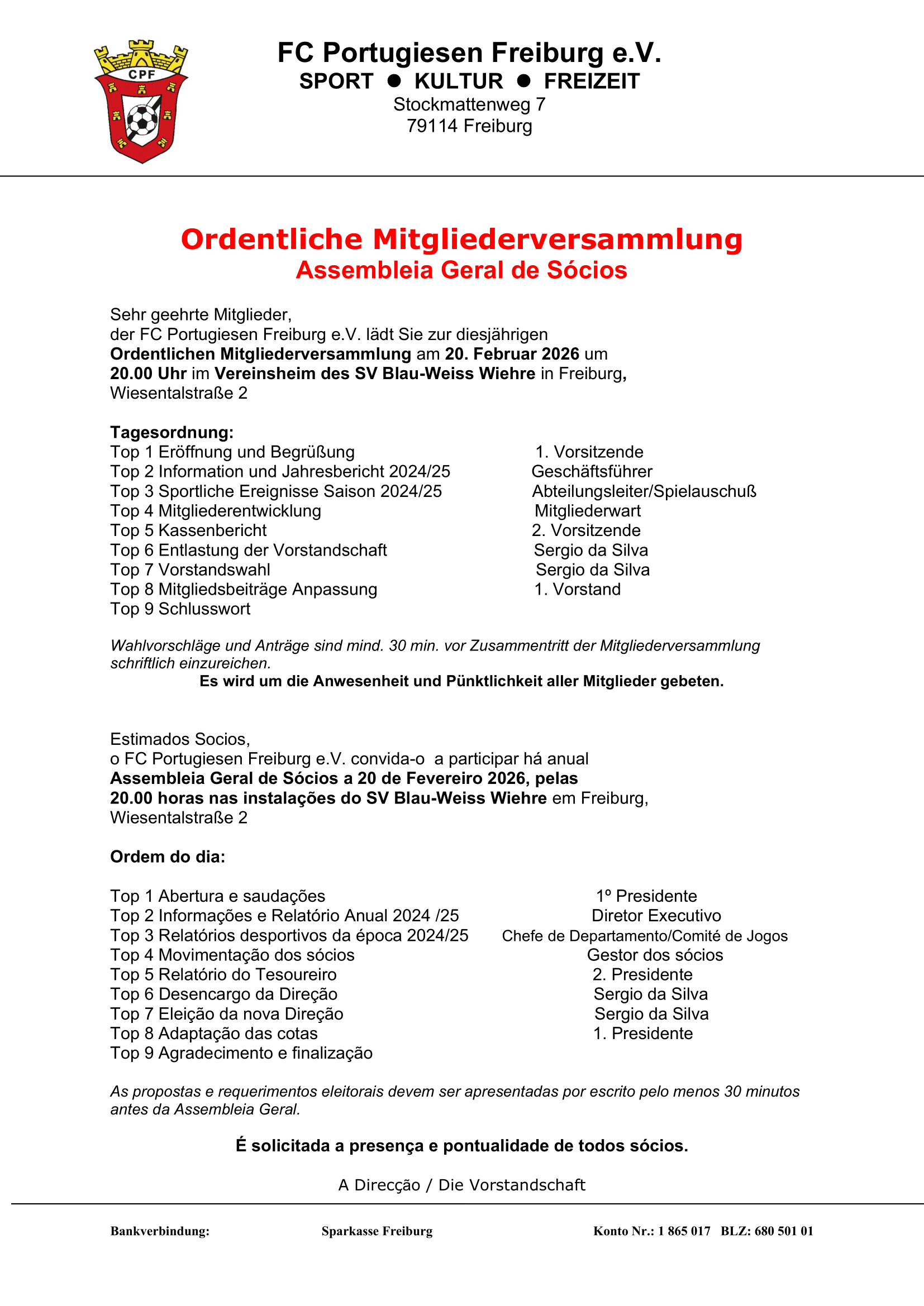 FC Portugiesen Freiburg AH - SG Broggingen/Tutschfelden AH 5:1 (1:0) Die erste halbe Stunde waren die Portos spielerisch dominant. Ließen aber reihenweise beste Chancen liegen. Es kann gleich erwähnt werden, dass der Torwart der beste Mann der Gäste war. Er verhinderte mit einem hervorragenden Reflex nach fünf Minuten die Führung. Danach tauchte er mehrfach blitzschnell ab und wehrte Flachschüsse ab. Nach einer halben Stunde gelang Patrick der erste Treffer. Einen Schuss wehrte der Torwart ab, aber genau mittig aus dem Sechzehner. Dort stand Lopi und traf das leere Tor mit einem platzierten Schuss, der Torwart lag am Boden und auch die Verteidiger konnten nicht mehr eingreifen. Direkt nach der Halbzeit musste Albo seine Klasse zeigen nach einem Abspielfehler im Aufbau parierte er den Flachschuss. Bei einem Freistoß hatte er Glück, dass der Stürmer das Tor verfehlte. Die erste Viertelstunde nach der Halbzeit war geprägt von Fehlpässen, die Gäste konnten aber kein Kapital daraus schlagen. Nach einer Stunde marschierte Mike von der Mittellinie los und traf hoch ins rechte Dreieck, am Boden war der Keeper kaum zu bezwingen. Doch quasi im Gegenzug der Anschlusstreffer, als sich die linke Abwehrseite nicht einig war, wer den Flankengeber stört. So kam die Hereingabe und Albo war geschlagen. Mit Michele di Carlo kam Ruhe ins Spiel und dann klappte es auch mit den Toren. Auf Flanke von Mike köpfte Ax in der 73. Minute das 3:1. Zwei Minuten später das zweite Tor von Doppelpaxl. Wieder lief Mike von der Mittellinie in den Sechzehner, legte dann aber ab für Doppelpaxl. Den Schlusspunkt setzte Nando, mit einem weiteren Assist von Mike. Mit einem Fernschuss aus dem Anstoßkreis wollte er den Torwart überlisten, traf aber nur die Latte. Nando brachte den Abpraller dann zum 5:1 im gegnerischen Tor unter. Danach noch eine Parade von Albo und der Sieg war eingetütet vor den Augen Überraschungsgastes (aus Berlin) Rene Pöttgen.